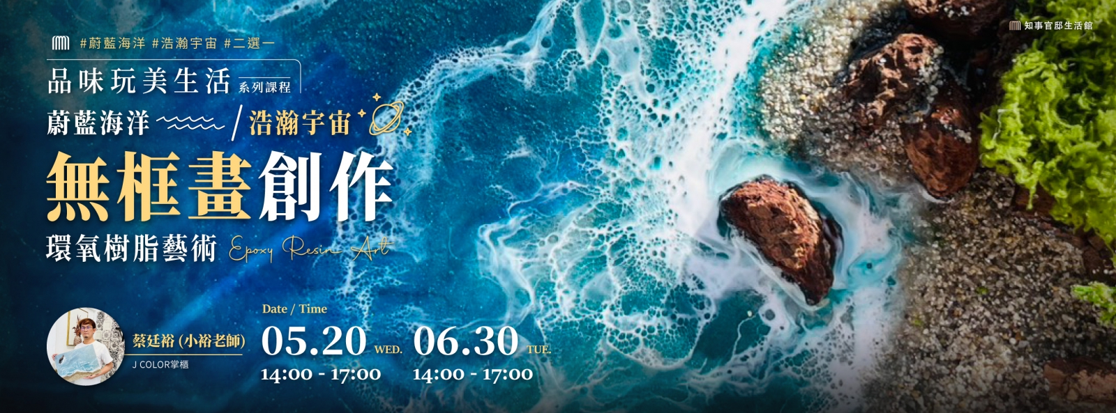課程主題【品味玩美生活】環氧樹脂藝術 ▸ 蔚藍海洋OR浩瀚宇宙無框畫創作- 【A班】2026/05/20(三) 14:00-17:00