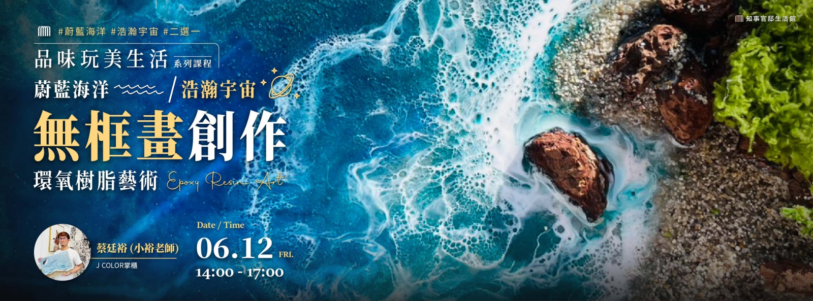 課程主題【品味玩美生活】環氧樹脂藝術 ▸ 蔚藍海洋OR浩瀚宇宙無框畫創作- 【A班】2026/05/20(三) 14:00-17:00 已額滿
