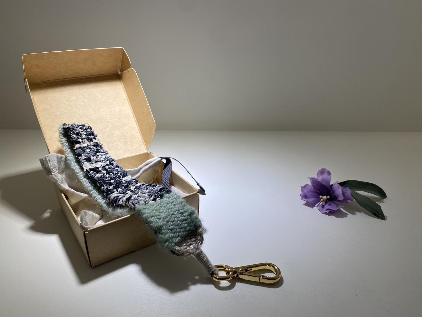 ✨利用布條紗、毛線織作後進行後至加工成掛繩。