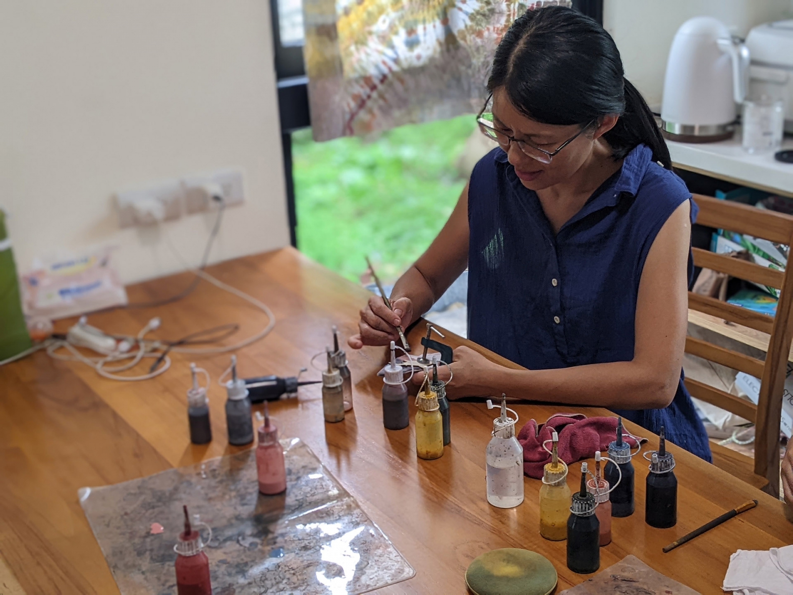 長期進行天然素材的創作,專注於泥染、礦物與植物染的探索。比起追求鮮豔與控制,更關注材料本身的特性、限制與自然形成的美感。