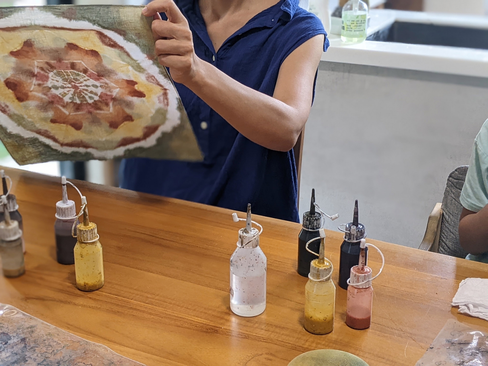 以取自天然泥土、礦物與植物染料進行染布創作,無化學染劑,雙手可直接觸摸,感受材料最真實的回饋。